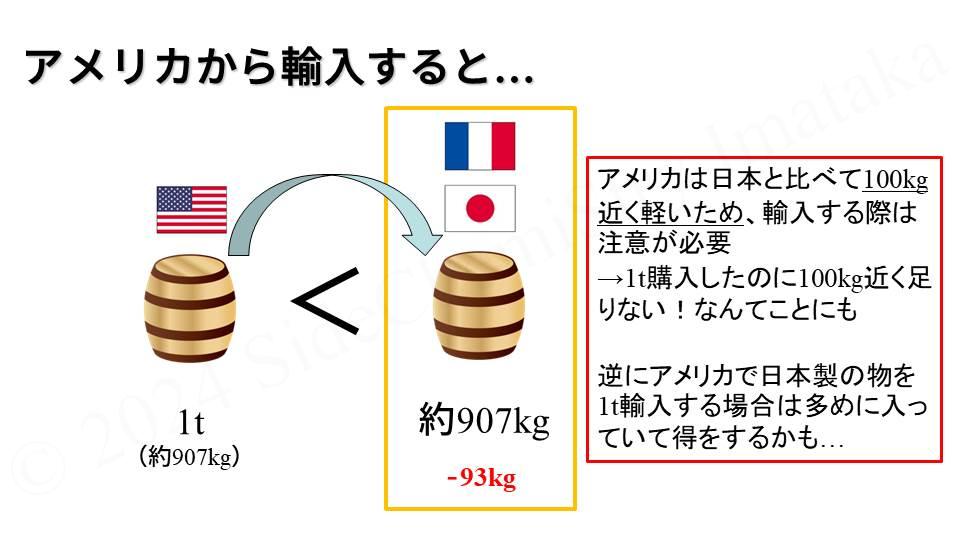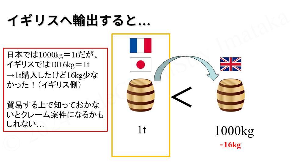 なので、海外へ輸出する場合は1metric tonとして送るか、相手側に合わせてちょっと多めに1T(1016kg)送るかしたほうがトラブルは避けられるでしょう。
