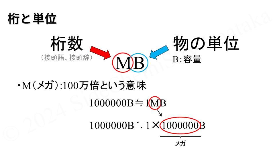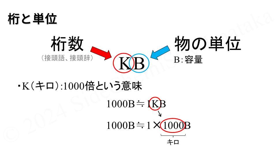 バイト以外の大体の単位は=で結ばれます。(メートル等 1km=1000m)