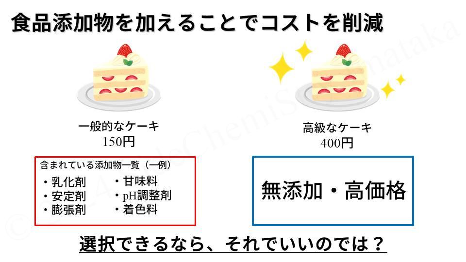 食品添加物は製法の簡略化や原価を抑えるといったコストカットが主な役割です。